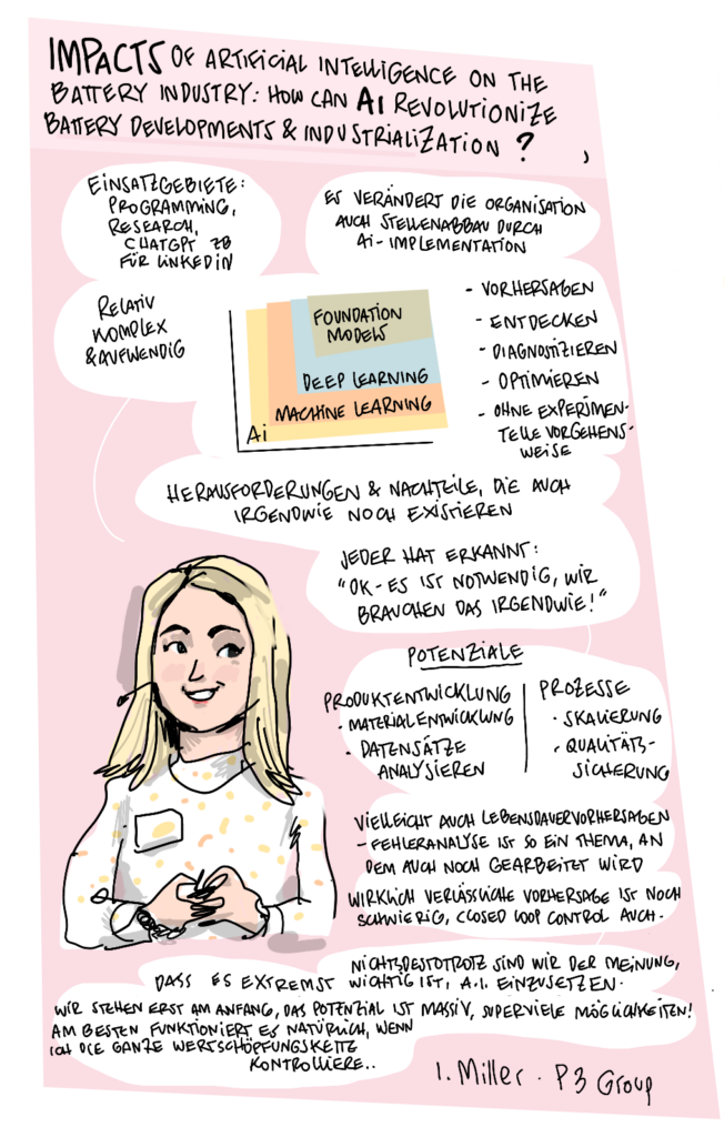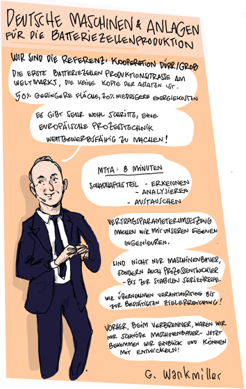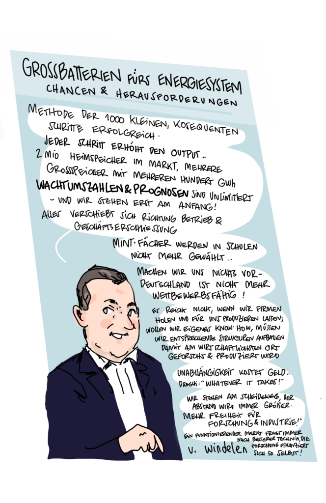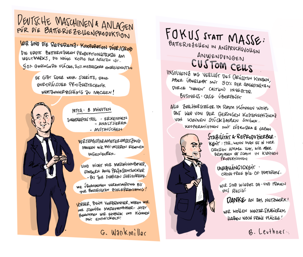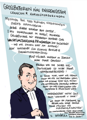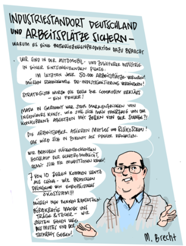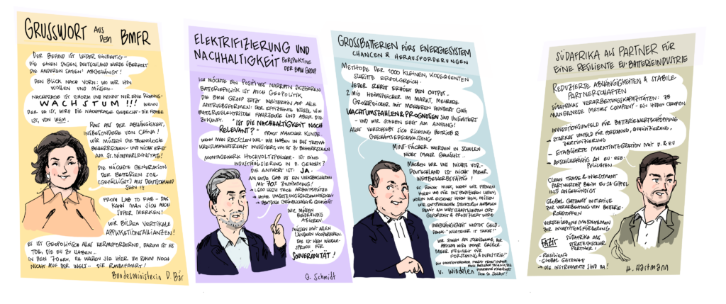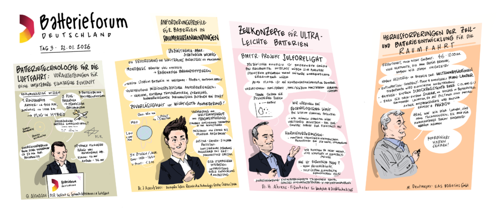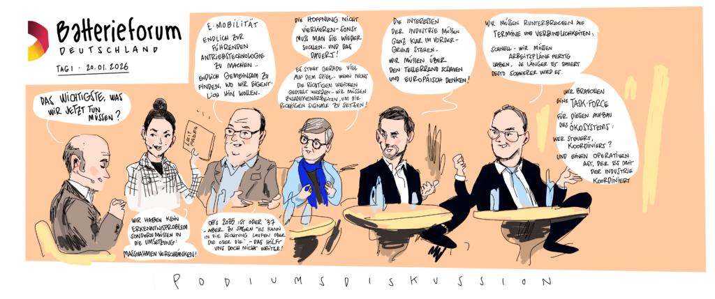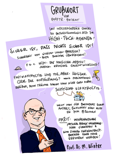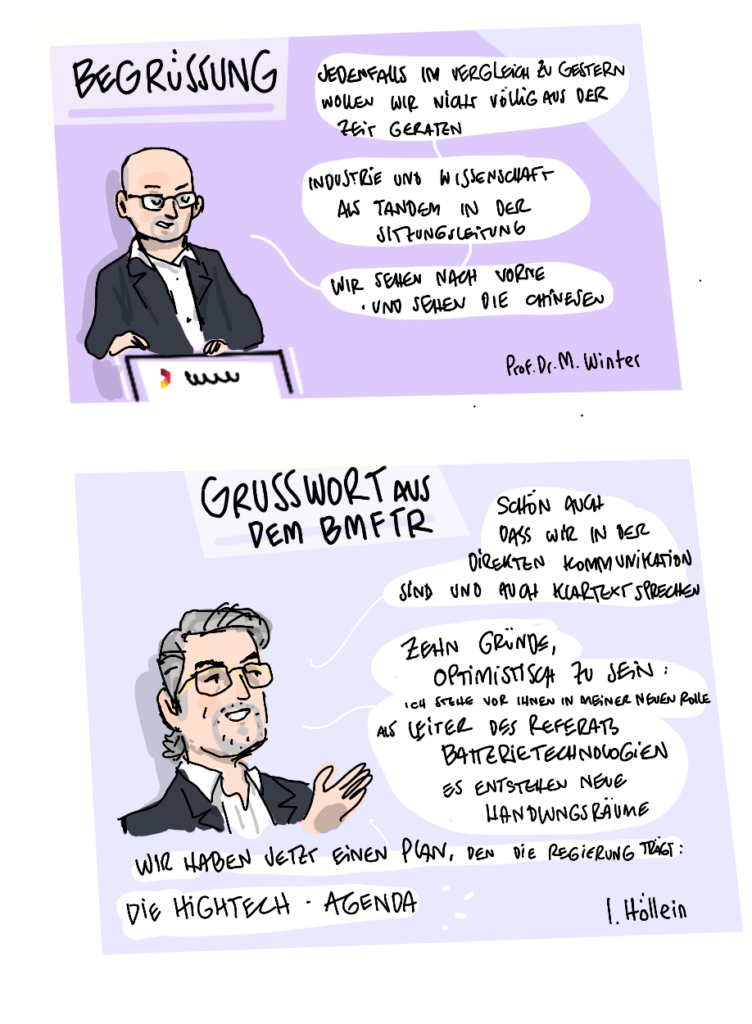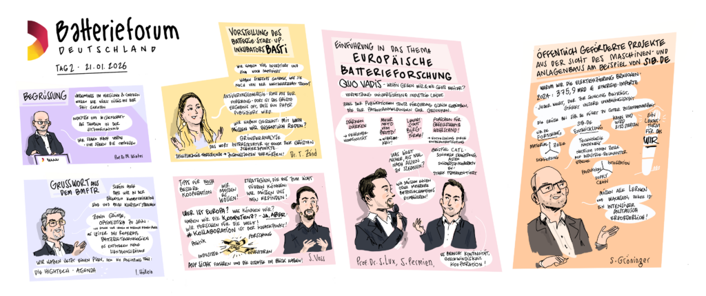 Im Januar 2025 veranstaltete das Kompetenznetzwerk Lithium-Ionen-Batterien (KLiB) e. V. mit Unterstützung des Bundesministeriums für Bildung und Forschung (BMBF) zum 13. Mal das Batterieforum Deutschland. Als besonderer Gast beehrte uns in diesem Jahr der Bundesminister für Bildung und Forschung Cem Özdemir. Zum ersten Mal haben wir die Eindrücke nicht nur von unserem Fotografen Markus Braumann einfangen lassen, sondern auch von dem Hamburger Illustrator Till Lassmann. Wir danken allen Referent:innen und Moderator:innen für die spannenden Sessions und natürlich den Teilnehmer:innen, den Sponsoren, dem BMFTR-Beirat Batterieforschung Deutschland und allen, die dieses besondere Event ermöglicht und mitgestaltet haben.